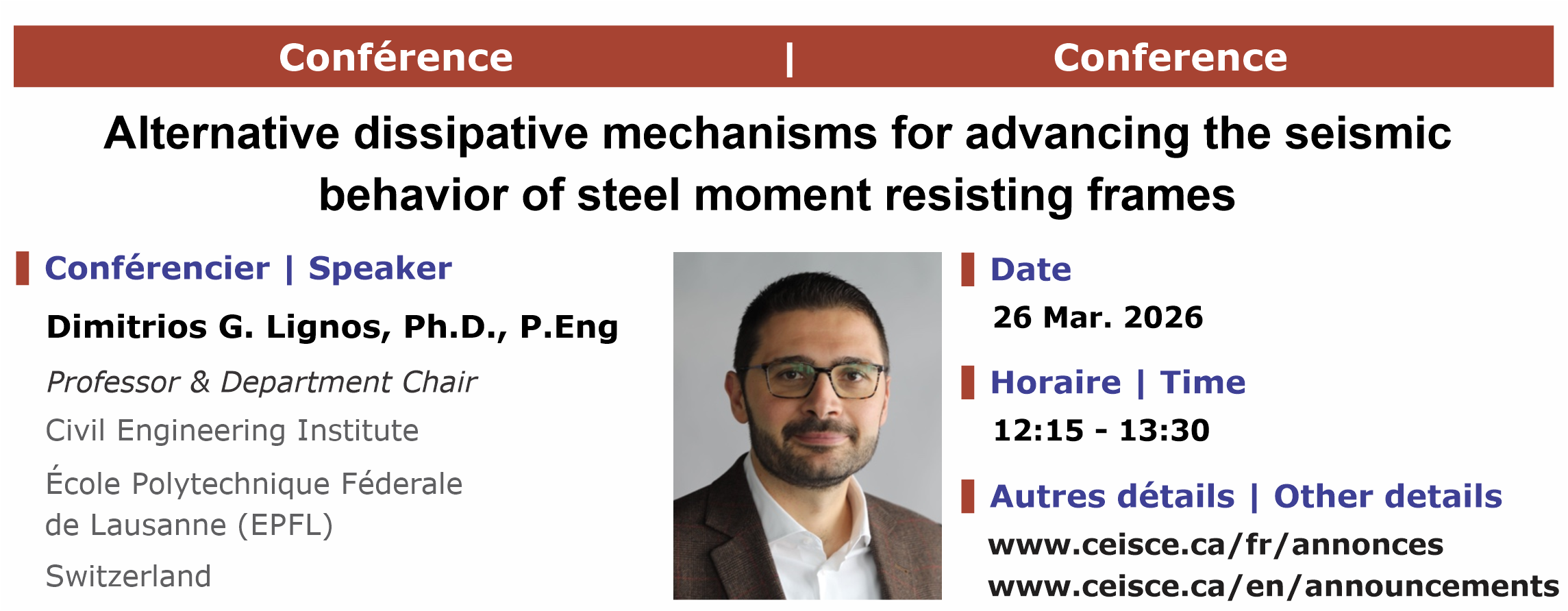 CEISCE is a multi-institutional strategic research cluster dedicated to the safety of civil engineering structures subjected to extreme effects induced by natural hazards, climate change and human activities. The researchers of CEISCE share highly qualified personnel, cutting edge laboratory equipement and technical ressources. In particular, the research Center operates one of the largest networks of structural laboratories in Canada, renowned worldwide for several innovative contributions.